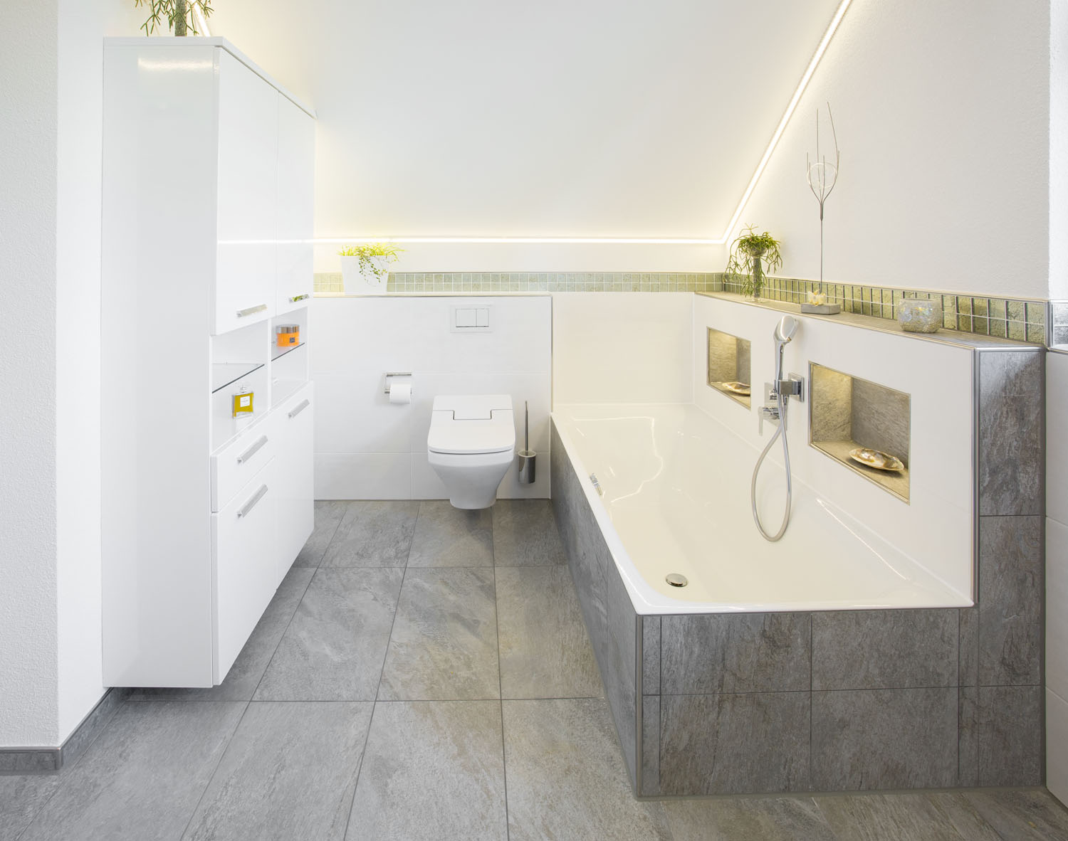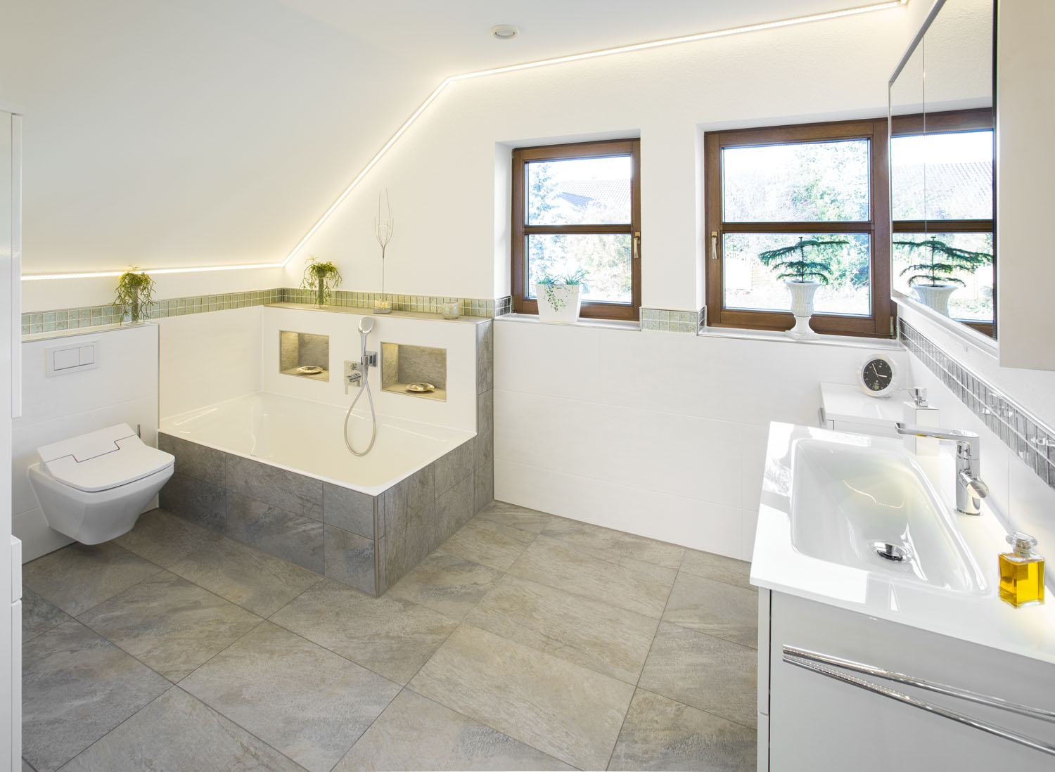 mit hintergrundbeleuchtetem burgbad eqio Glas-Waschtisch, HANSA Ligna Armaturen, BETTELUX Badewanne sowie DURAVIT Durastyle Dusch-WC mit SensoWash WC-Sitz